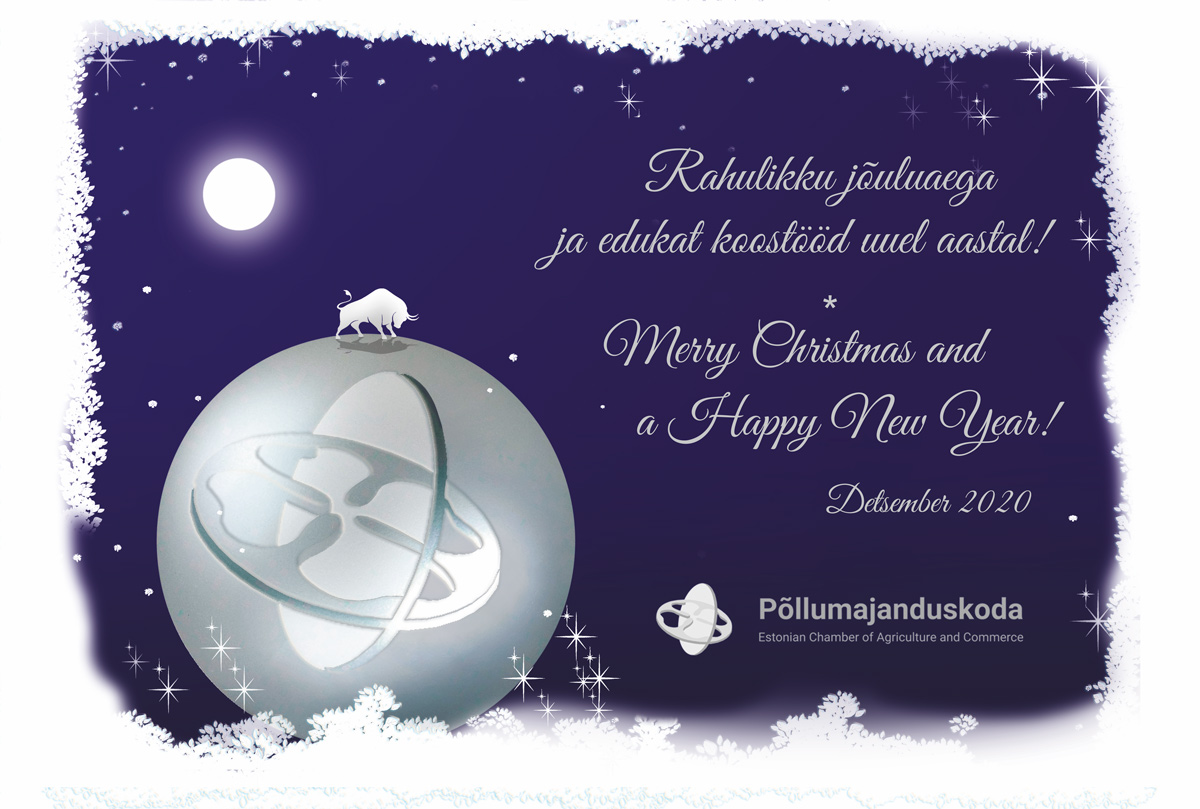 AiandusKodaLihaPiimPõllumajandusTeraviliToidutööstus Kauneid jõulupühi ja viljakat koostööd uuel aastal! 22. dets. 2020 Eesti Põllumajandus-Kaubanduskoda tänab kõiki liikmeid ja koostööpartnereid meeldiva koostöö eest lõppeval aastal! Soovime kõikidele rahulikke jõulupühi ja head uut aastat!