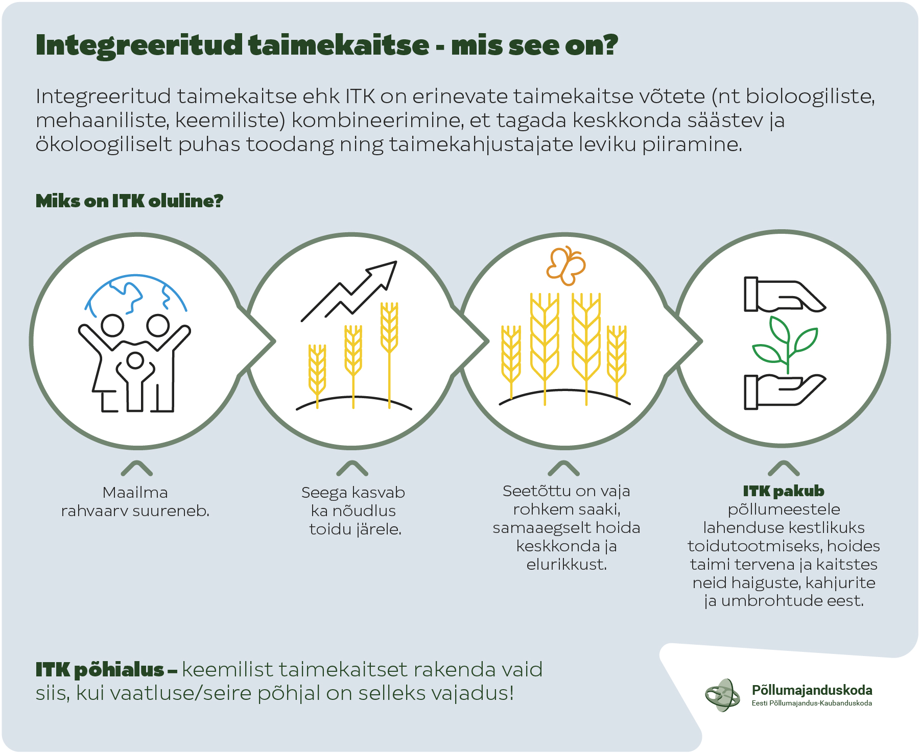 Professionaalsele taimekaitsevahendite kasutajale on kohustuslik rakendada integreeritud taimekaitse (ITK) põhimõtteid. ITK eesmärk on bioloogiliste, mehaaniliste ja keemiliste taimekaitselahenduste hoolikas kombineerimine nii, et teostatud töö oleks minimaalse ohuga inimese ja loomade tervisele ning keskkonnale. ITK on keskkonda säästev ja tagab ökoloogiliselt puhta toodangu.